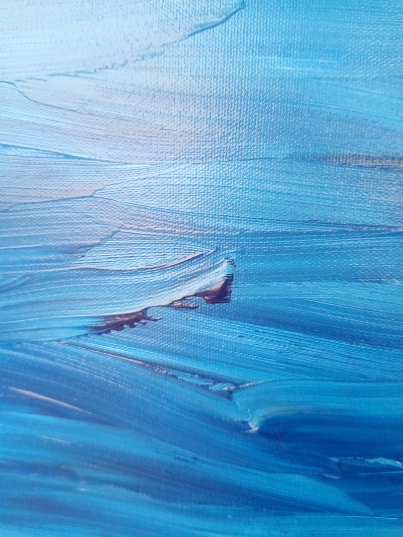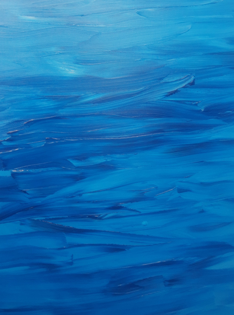 Blue Silence holds its breath beneath the surface. Light dissolves into depth, and what remains is a quiet, immersive field of blue—layered, shifting, unknowable. The palette knife traces currents rather than forms, as if the sea itself is remembering how to move without disturbance.