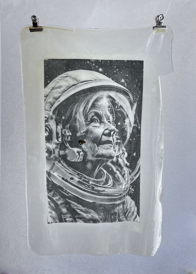 A luminous senior woman floats in a space helmet — dignified, curious, and ageless. She becomes an emblem of potential unbound by time. This piece from The Whisper Within series reframes ageing as expansive and limitless, not diminished. Crafted on bioplastic—a regenerative, sensory material—her face is reverse printed and activated with light and frequency. She becomes both myth and memory, a keeper of futures imagined through resilience and softness. The work explores ageism, time collapse, and the role of older women in speculative futures.