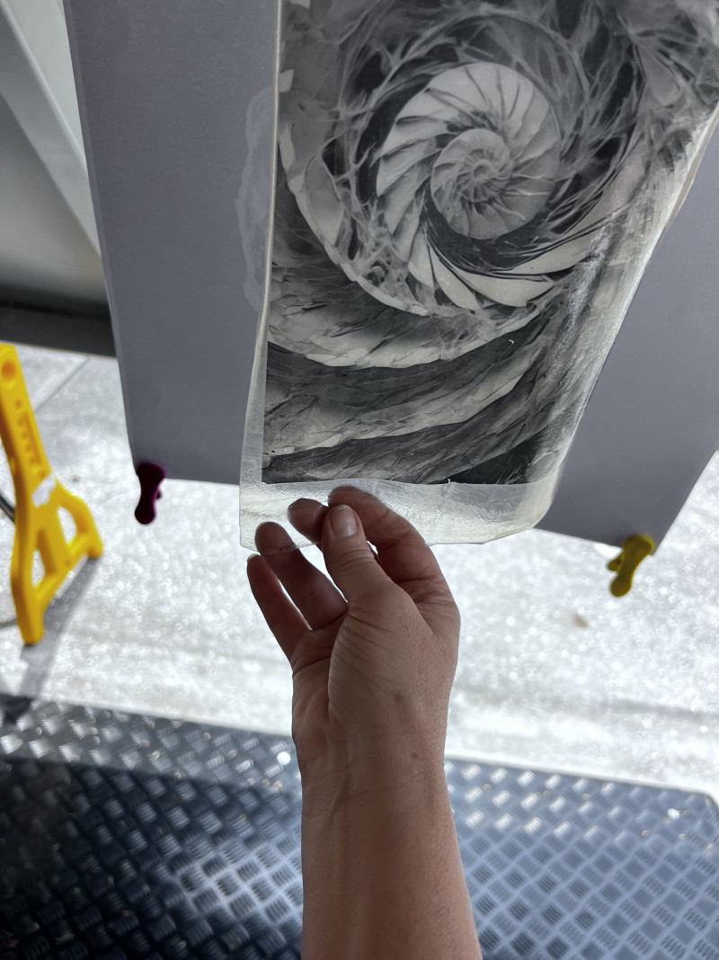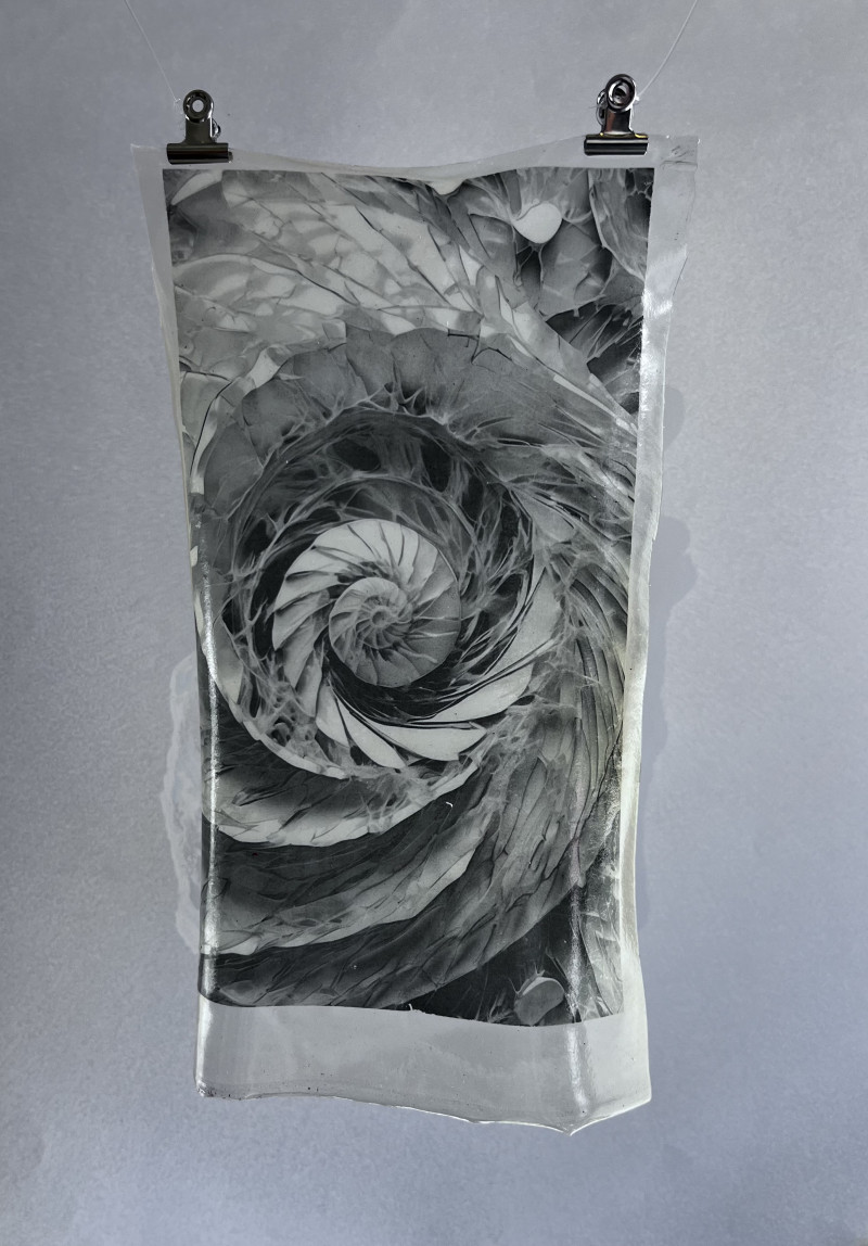 A nautilus-like spiral emerges from layers of image and translucence — part fossil, part galaxy.