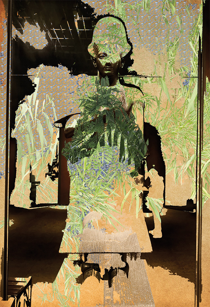 “This work is a composite symbol built upon layered mediums, weaving together ancient and contemporary influences. At its core, it represents the union of Upper and Lower Egypt, depicted through adapted hieroglyphs inspired by the Sema-Tawy motif—a symbol of unity featuring the intertwined lotus flower (representing Upper Egypt) and papyrus (symbolizing Lower Egypt). These botanical elements are reimagined as dynamic, flowing forms that evoke both harmony and transformation. Adding a playful yet profound layer of meaning, the ‘X Cape’ within the piece draws inspiration from the iconic opening mission of Crash Bandicoot 1, a vintage console game where the protagonist lands on a tropical isle.