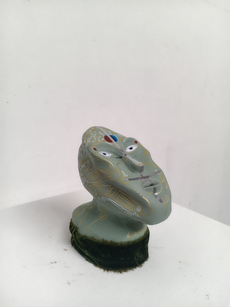 Clay, oil, pigmented gold foil and ink.