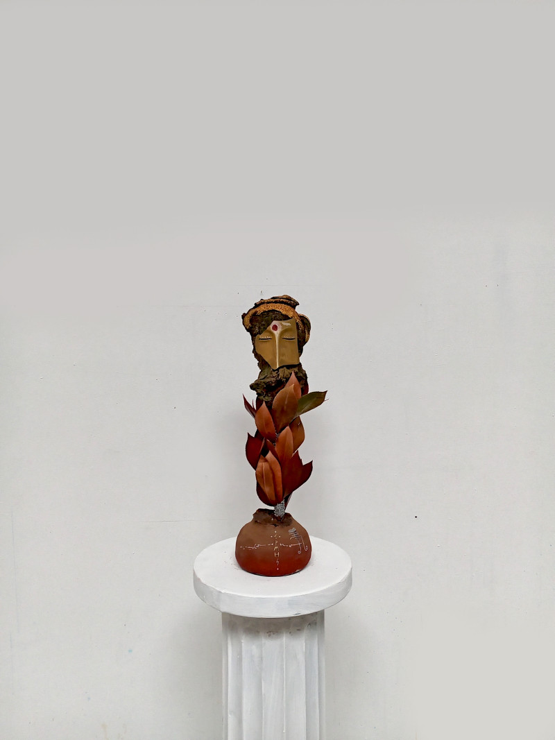 Mixedmedia. Wood, found objects, steel, iron, lavic stones, pigmented clay & dust, acrylics, pigments.