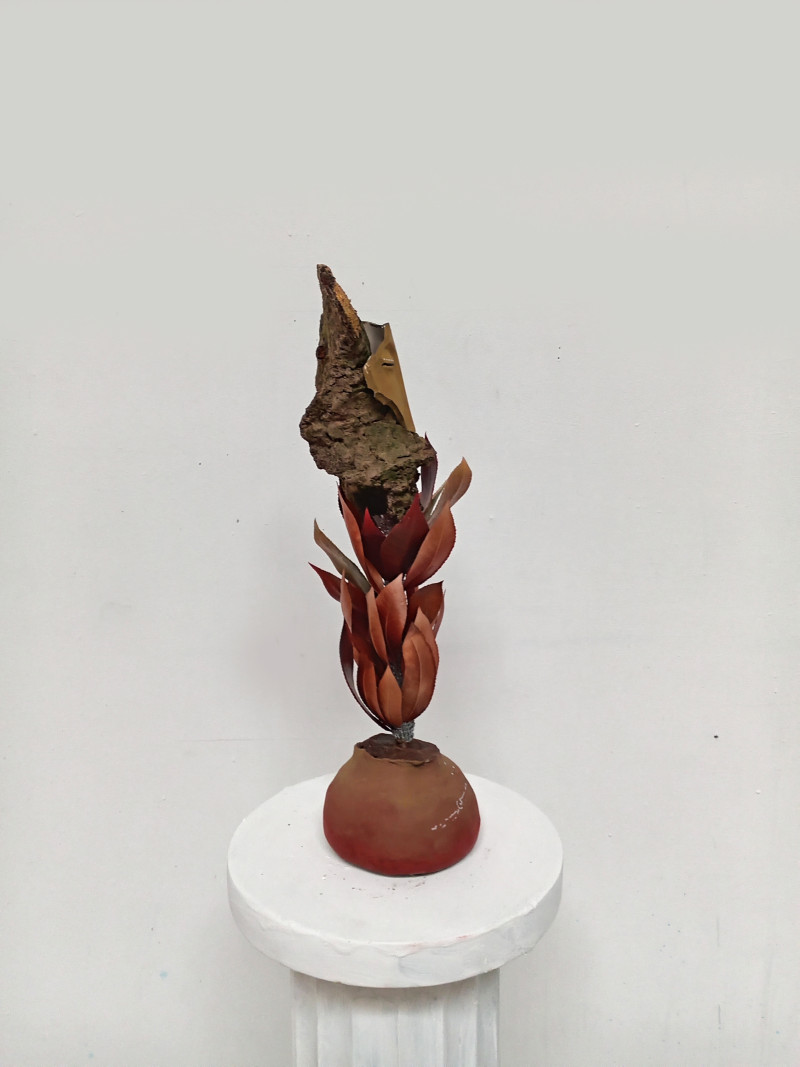 Ceramic, Fungus, Found Objects, Alloy, Steel, Larch Leaves, Clay, Pigments, Acrylics and Ink