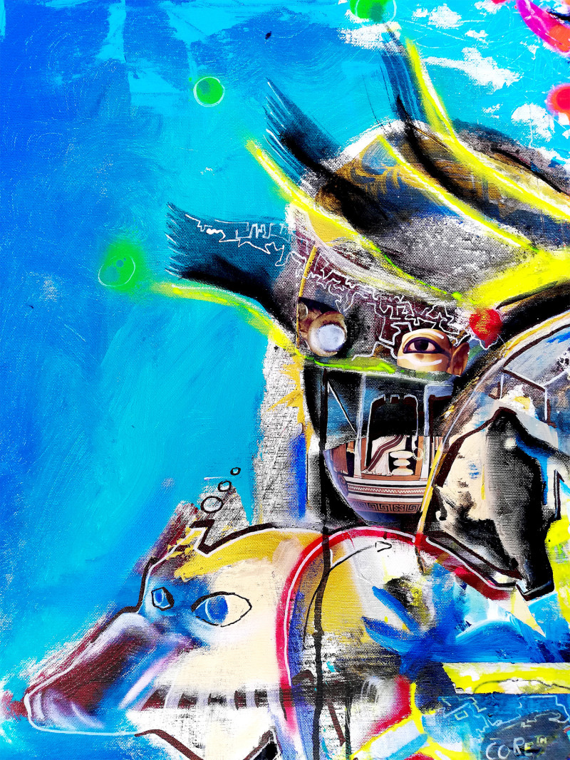 "Space Cadet" marks the beginning of my journey as an artist—a dive into the unknown, emerging as a cadet navigating the chaotic morgue of the urban landscape. This piece represents my first sold painting, a milestone where art became both my compass and shield. Just one week after unveiling it to the world, it found its new home, a testament to the resonance of its message. Free from the constraints of guilds or rigid structures, it embodies the boundless exploration of creativity, where space and time float beyond the studio walls. Art, here, is a universal aegis—a protective force and a guiding light, transcending limits and grounding me in the infinite possibilities of expression."