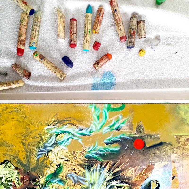 Oil pastels, natural pigments and sprays on archival paper