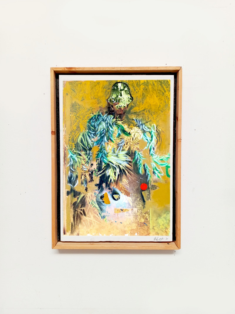 Overlying elements applied from a pre-worked HDR ultra-chrome ink transfer print on velvet matte stock paper.