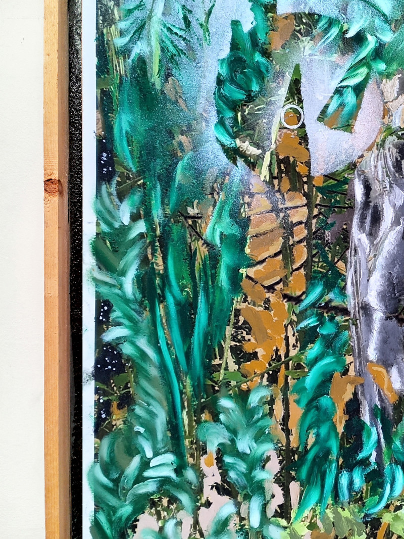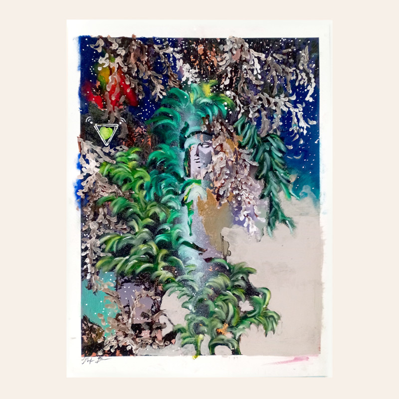 A green growth emerges against an ocher backdrop, merging the divine figure that humanity seeks in its relationship with nature. *Orama*, derived from the Greek word for ‘vision’, reflects the intimate connection between the observer and the natural world. Like the dynamic between two lovers, this vision of nature becomes a mirror, revealing the spiritual elements that animate my gestures and creative impulses. The process begins with slow, deliberate drawing and cutting, followed by swift compositional decisions after scanning drafts and sketches. The result is a fusion of statuary icons and vegetal patterns, a mental exploration of the ancient relationship between humans and their natural environments. Through art and the depiction of nature, this work delves into the hidden aesthetic sublimation that has shaped our understanding of the world for centuries.