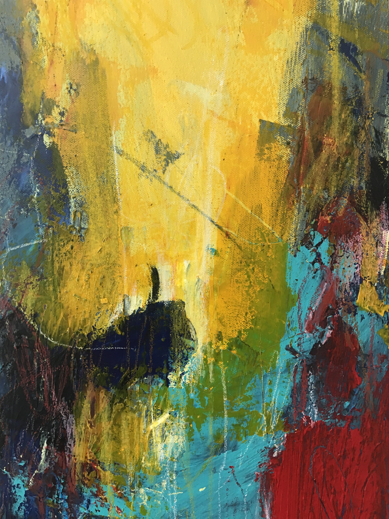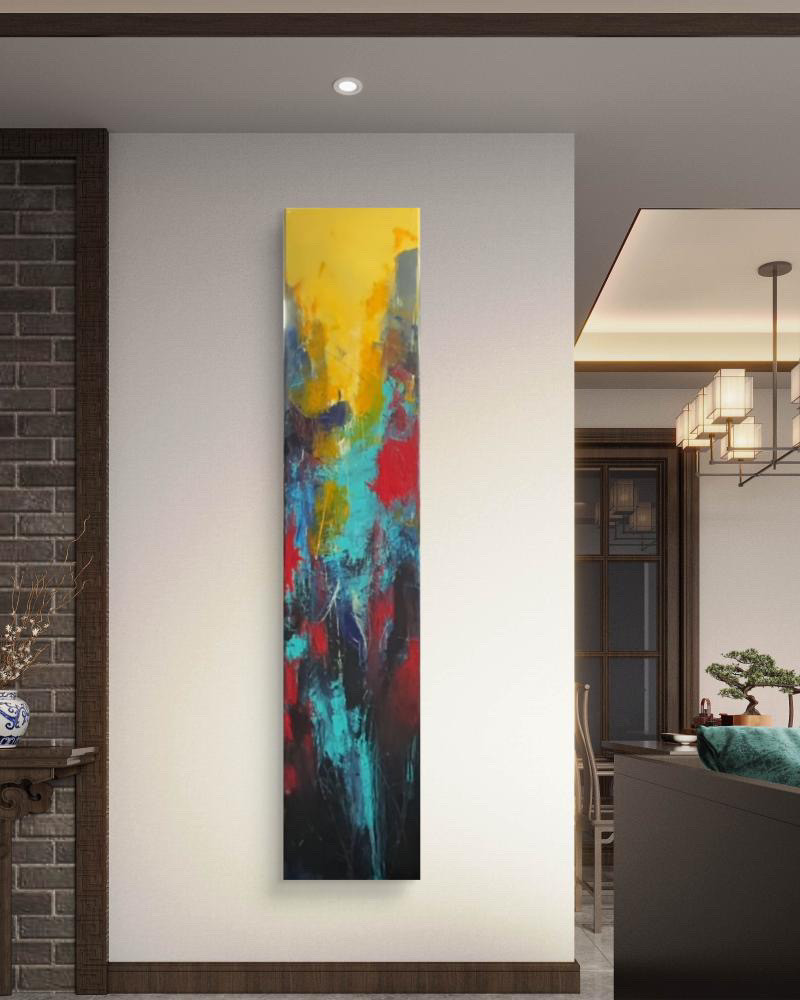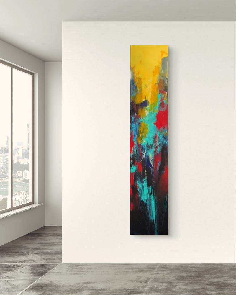 Dieses Bild ist ein Spiel aus Energie, Tiefe und Kontrast. Ich habe bewusst ein extrem schmales Hochformat gewählt, um die Bewegung nach oben und unten zu betonen – wie ein Farbstrom, der gleichzeitig aufsteigt und absinkt. Das leuchtende Gelb oben steht für Wärme, Klarheit, vielleicht sogar einen Moment der Erkenntnis. Unten wird es dunkler, dichter, fast bedrohlich. Türkis, Rot und Schwarz prallen aufeinander, durchdringen sich, reißen sich auf. Die Strukturen entstehen spontan – aus dem Impuls, nicht aus dem Plan. Für mich ist es wie ein Blick in einen inneren Zustand: chaotisch, intensiv, aber lebendig.