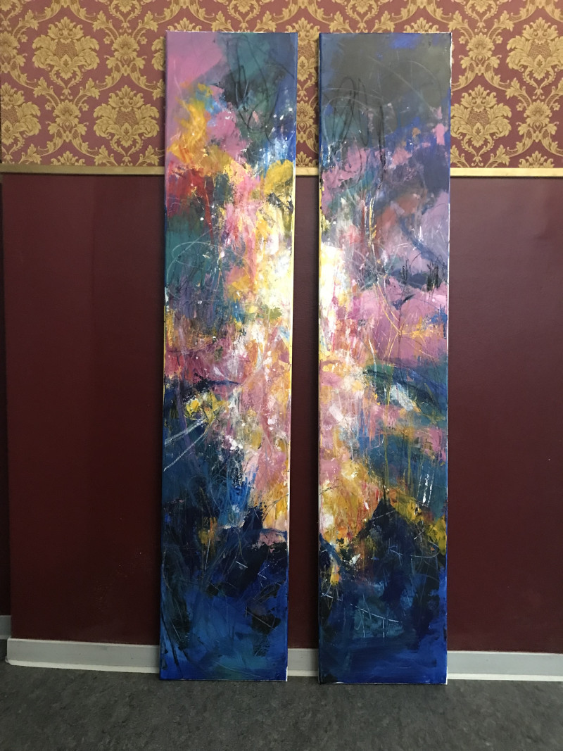 Dieses zweiteilige Werk ist für mich wie ein farblicher Riss durch ein inneres Gefüge. Ich habe intensiv mit Schichtung gearbeitet – leuchtende Farben wie Pink, Gelb, Türkis und dunkles Blau stoßen aufeinander, überlagern sich, flackern auf und verschwinden wieder. Die beiden Tafeln gehören zusammen, funktionieren aber auch gegeneinander – wie zwei Stimmen, die sich nicht immer einig sind, aber ein gemeinsames Thema tragen.