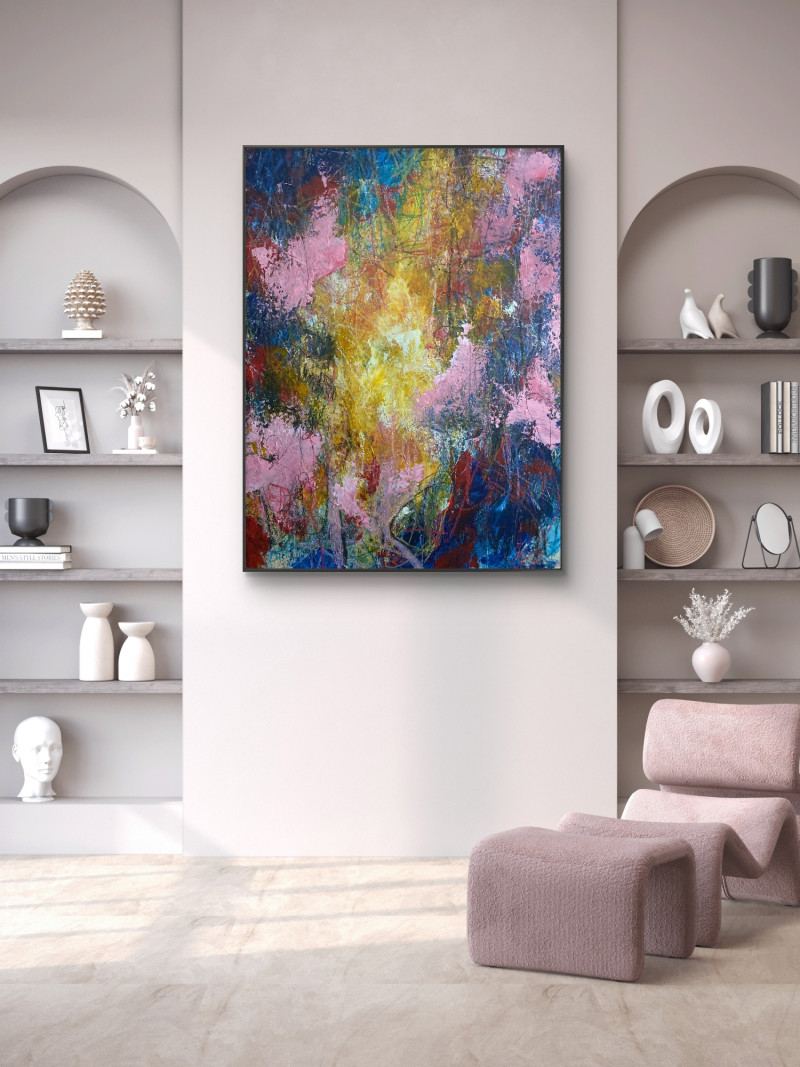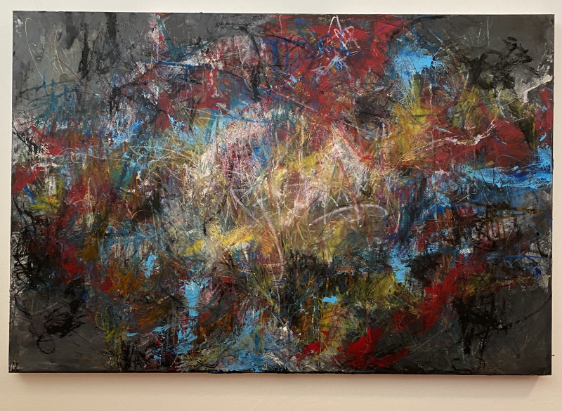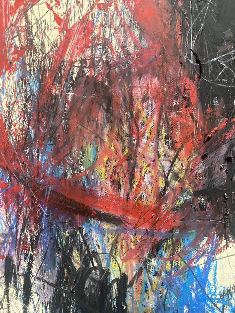 The painting speaks of transitions—of inner movement within outer stillness. It invites the viewer to pause, to lose themselves in the fragile space between emergence and withdrawal. The eye wanders through layers of energy and restraint, expressive gestures and fragmented traces.