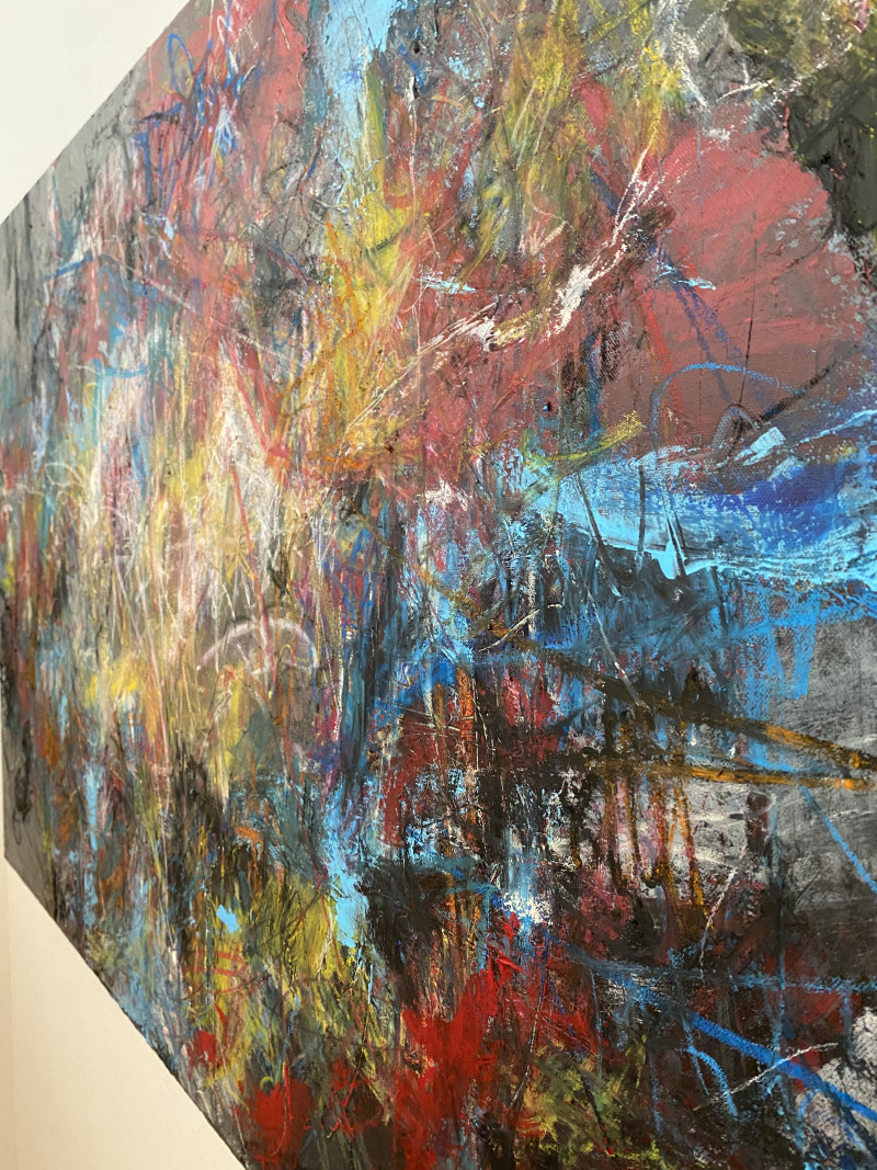 Die Materialiät des Bildes scheint durch dicke Farbaufträge und expressive, fast gestische Bewegungen verstärkt zu werden. Diese erzeugen eine dreidimensionale Wirkung, die sich ständig verändert, je nachdem, wo das Auge verweilt. In den dunkleren Bereichen entsteht ein Gefühl von Tiefe und Unendlichkeit, während die helleren Farben Energie und Bewegung ausstrahlen.