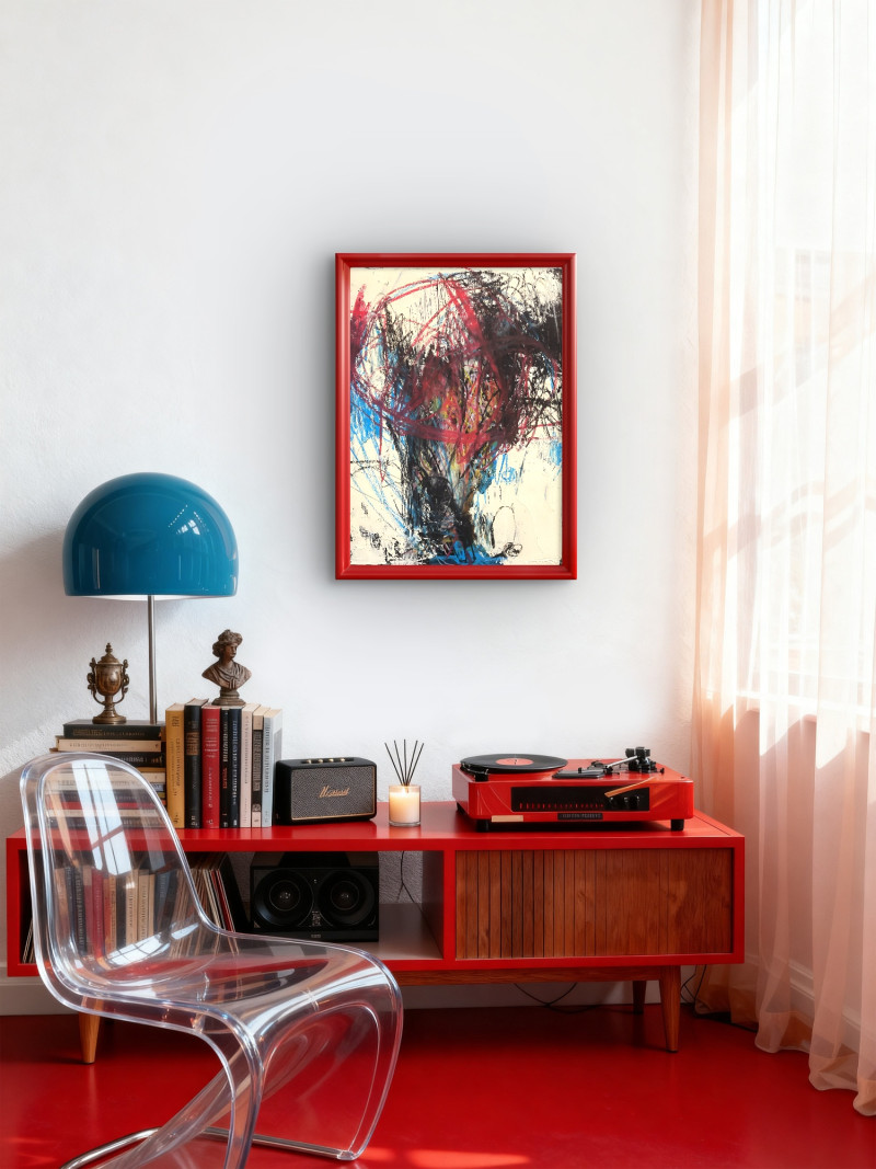 „Konstante im Chaos“ zeigt eine dunkle, abstrakte Komposition mit wilden Linien, Farbschichten und kratzigen Strukturen, die Unruhe und Bewegung vermitteln. Inmitten dieses scheinbaren Durcheinanders schwebt ein geometrisch präziser, roter Würfel – ein fester, klar definierter Körper, der sich deutlich vom chaotischen Hintergrund abhebt. Der Würfel symbolisiert Halt, Ordnung und Beständigkeit, während die expressive Umgebung für das Chaos des Lebens steht. Die warme, hölzerne Rahmung verstärkt den Eindruck eines geschützten Raums. Dieses Werk spiegelt den persönlichen Anker des Künstlers in der Kunst wider – eine Konstante inmitten der Unsicherheiten des Lebens.