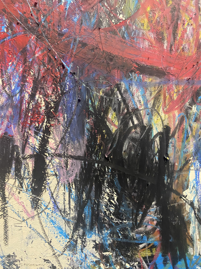 Das Bild spiegelt die Erforschung eines farblichen Mikrokosmos wider, in dem chaotische Strukturen und feine Details eine komplexe, fast organische Tiefe erzeugen. Die Komposition besteht aus einem dynamischen Zusammenspiel von Farben. Leuchtendes Blau, intensives Rot, erdiges Gelb und dunkle, fast schwarze Flächen formen eine lebendige Textur.