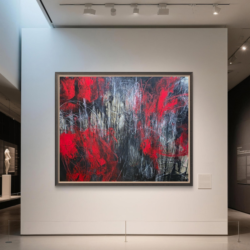 Feuer ist zugleich Ursprung und Ende, Schöpfung und Vernichtung. In „Fire“ verdichten sich diese Gegensätze zu einem rohen, expressiven Ausdruck von Energie und Bewegung. Die dunkle Grundierung verschluckt das Licht, während rote Glut aus der Tiefe aufsteigt – ein Kampf zwischen Ordnung und Chaos, Form und Auflösung.