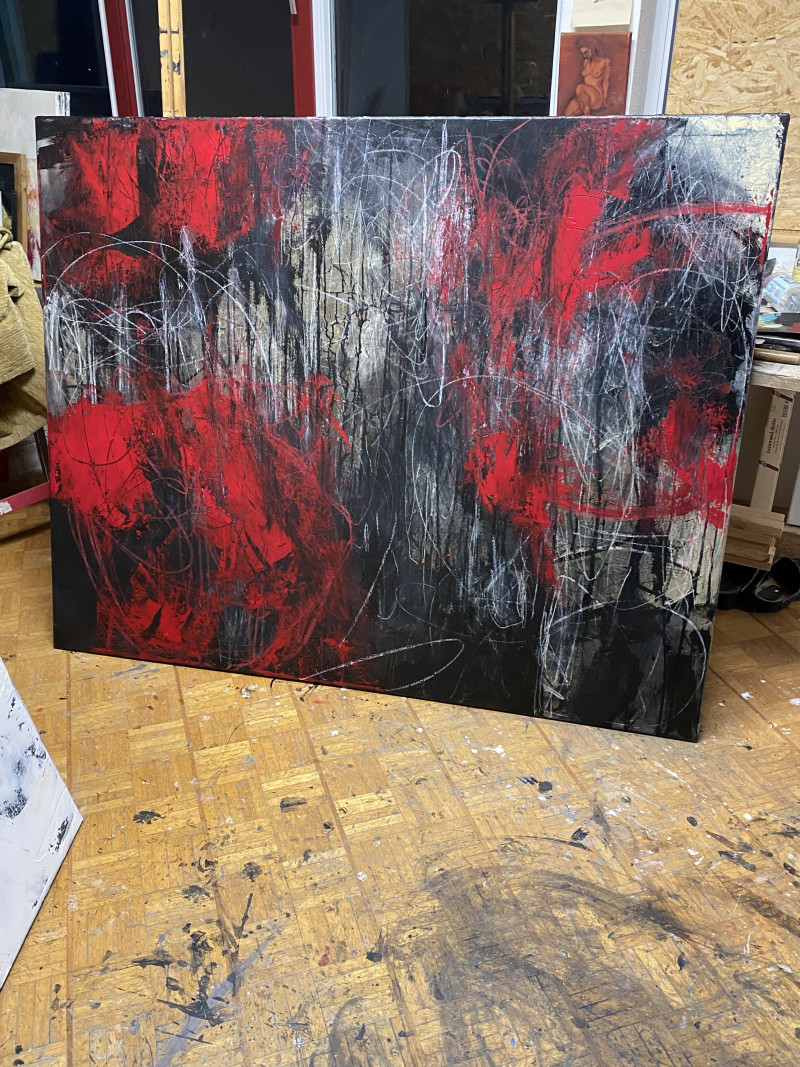 Die Energie kommt aus dem Kontrast: Licht trifft Dunkelheit, Bewegung trifft Fläche, Kontrolle trifft auf rohe Intuition. Beim Malen war ich sehr körperlich – Kratzen, Wischen, Übermalen – ich wollte nicht schön sein, sondern wahr. Das Bild erzählt von Aufbruch und Rückzug, von innerem Chaos und der Suche nach Klarheit. Es ist kein Ergebnis – es ist ein Zustand.
