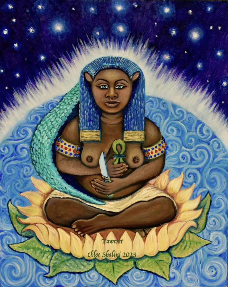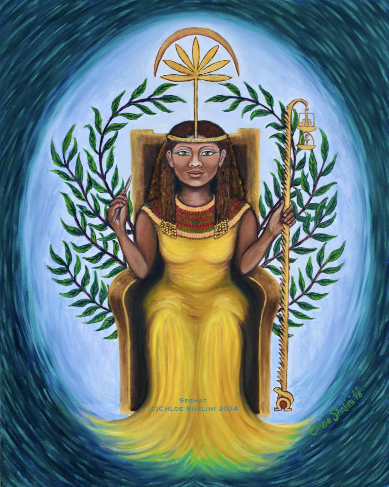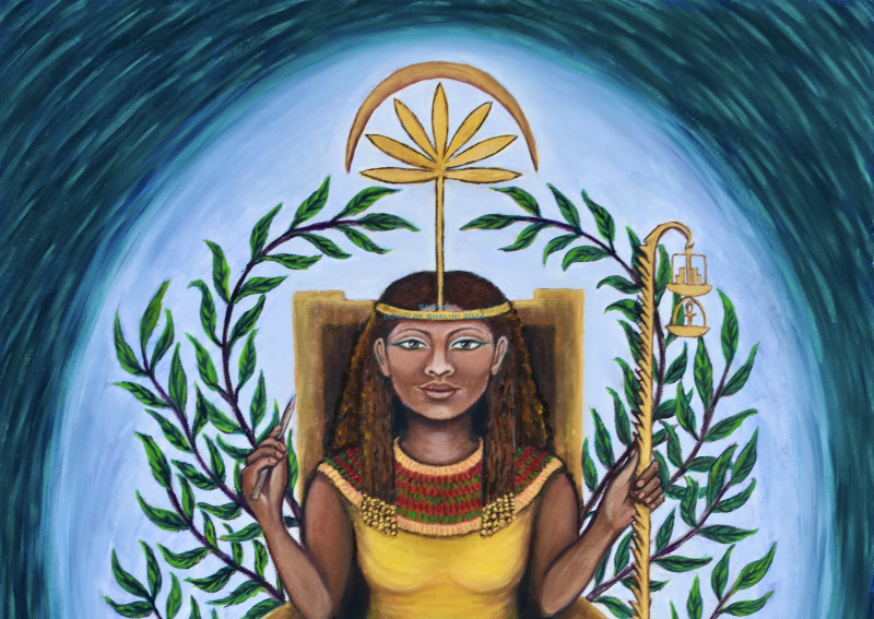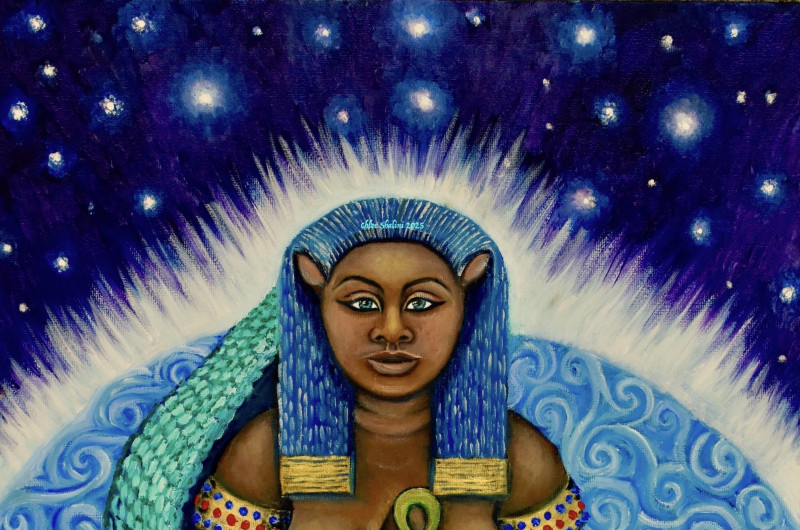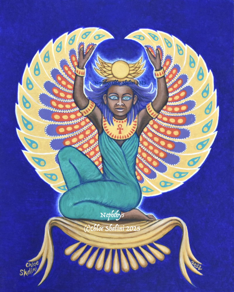 Often found in ancient Egypt alongside Isis/Auset as a protector, signified by the outstretched wings, Nephthys, (her Greek name)(pronouced, Nef-teez/Nef-this) sits on folded cloth of gold from which 13 golden pearls hang, 13 being the number of transformation. Her headdress I have painted to represent the wings of a kite or hawk, birds she has been associated with.
