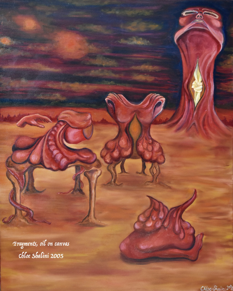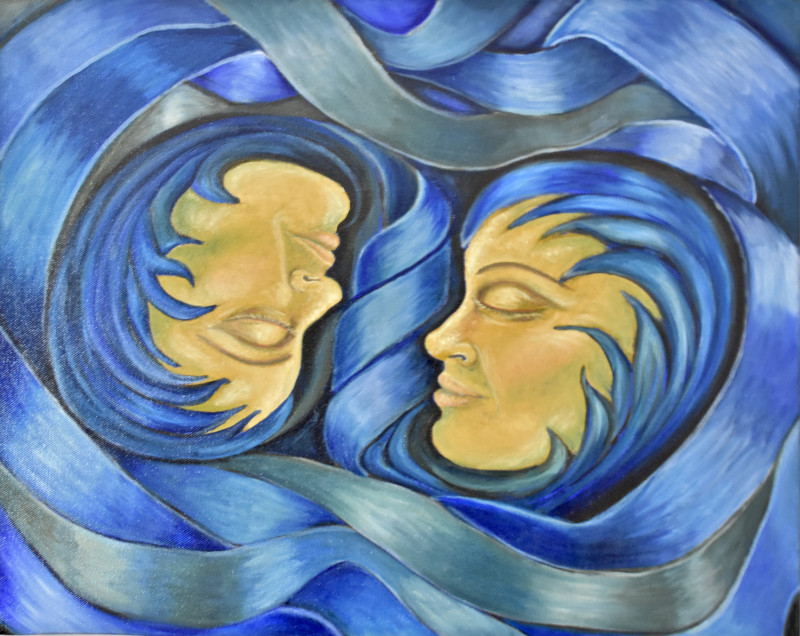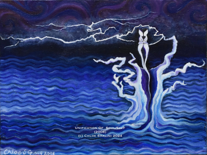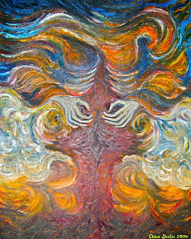 Oil on canvas. The cobalt blue background suggests the template level reality, the flames and mottled energy are both an indication of the non-physical Soul self, within which is created the physical form.