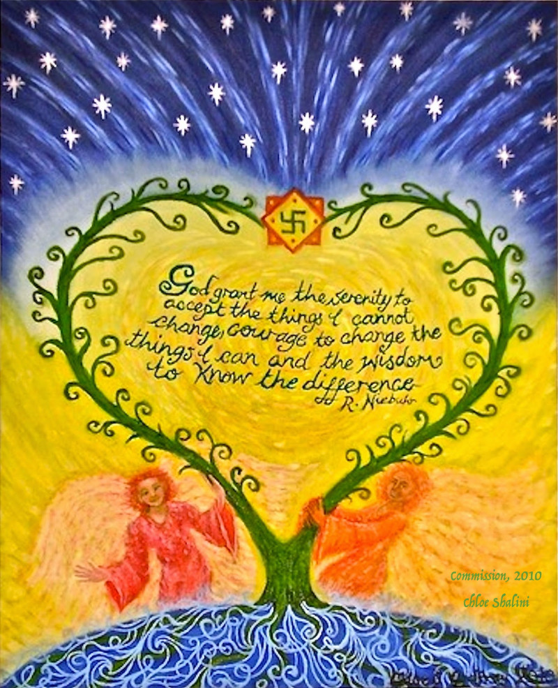 Commission where I had free-rein as to how to depict this well known prayer or affirmation. Note - this includes the Hindu Swastika - an ancient symbol which was adopted for negative purposes by the Nazis. Traditionally, this is a postive symbol, believed to be at least 12,000 years old. It signifies peace, prosperity, auspiciousness, luck and universal brother/sisterhood. It's name is derived from a Sanskrit word 'swasti', meaning 'may all be well with you'. It is also used in Buddhism and Jainism.