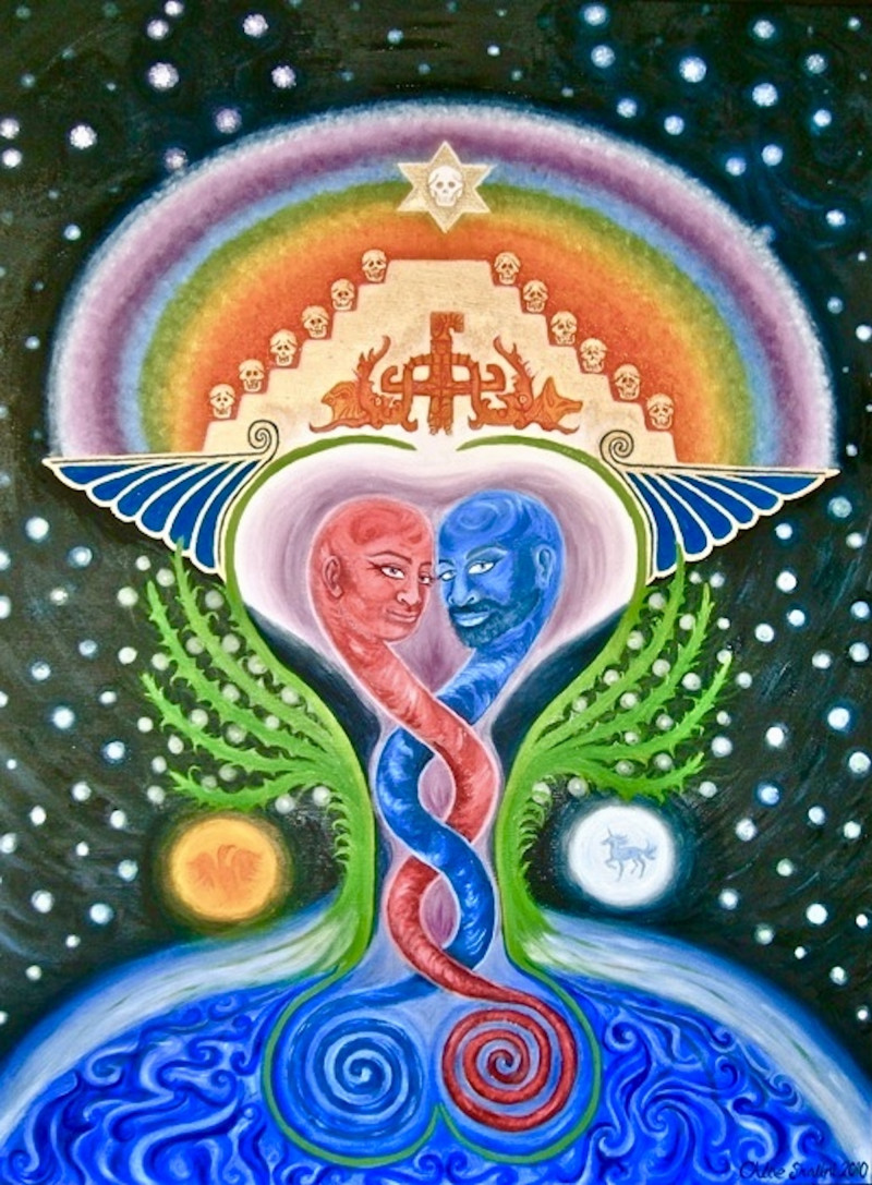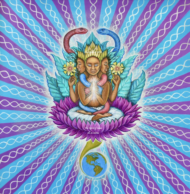 From my connection with the spirit of Cacao and Keith of Keith's Cacao - food for the Shift in Consciousness....In 2008 I met with Keith Wilson, the 'Chocolate Shaman'. Many twists and turns later and 'she' suggested I not only work with her but also paint her 'portrait'. My images are not literal representations but are intended as meditation and healing tools for those already aware of the spiritual dimensions. I have a 'mixed' background which is why my images often contain references from Hinduism, Judaism, Christianity and more. In this image I have painted a globe turned to show Guatemala, because this is where the true ceremonial form of Cacao is grown; most of the others available are hybrids which lack the ceremonial qualities. This form is the closest we have to the type used by the ancient Mayans, who considered 'her' to be a deity. 'She' is balanced in male/female energies (snake imagery), sitting atop a purple lotus to indicate her enlightening qualities. 'She' is sending out heart healing rays from her heart to ours. Her 3 faces represent past, present, future. Her eyes are open only at the front because she encourages us to live in the moment, but the past/present faces are also breathing in the scent of the flowers of the Cacao to indicate the lessons we gain from embracing our past pains and future fears. The radiating purple/blue rays I employ to suggest the energetic power Cacao has, while the white is a reference to the spiral and cosmic rays which are being sent to our planet by our Elders, assisting in our Awakening of Consciousness. Cacao has reintroduced herself to the World, to the West, largely thanks to Keith, the Westerner to whom she first connected, urging him to take Cacao "out of the rainforest", into the world at this time of need. Cacao is a gentle yet potent medicine - helping heal and awaken our hearts individually and thus collectively. See www.keithscacao.com for further info regarding cacao.