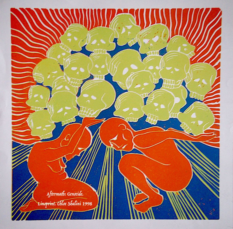 Lino print. Past and present genocide and war of all kinds always broke my heart thus I channelled some of that into several pieces of art.
