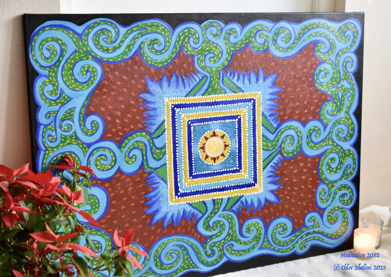 Inspired by a meditation into the Void, represented by the white centre. Outer colours suggest the lessons of the chakras/energy centres we travel through during this human life experience. The Indian-stylised lotus petals suggest the unfoldment of this life, of each chakra as we overcome the challenges inherent in the lessons of the chakras. The sky blue (throat chakra) indicates the enhanced flow in communication between the 'higher' and 'lower'/persona selves that we develop as we deepen trust in our own inner being, inner knowing. Framed in white painted wood, ready to hang.