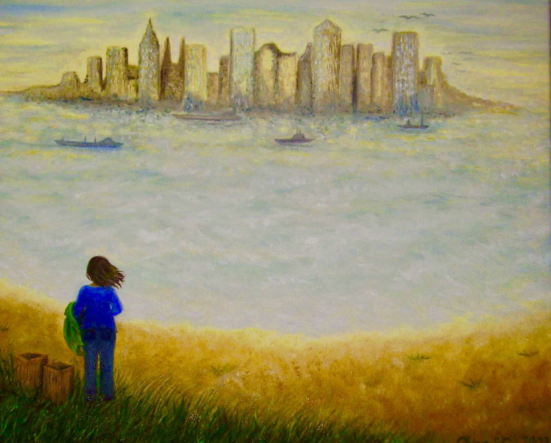 The background is based upon an image of New York harbour, seen from Ellis Island, taken in the 1920s, the overall point to convince myself to enjoy this process we call 'life', no matter the challenges. The empty boxes indicate the stage of being ready to move forward without the baggage of the past weighing us down.