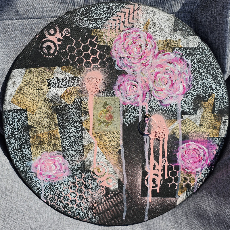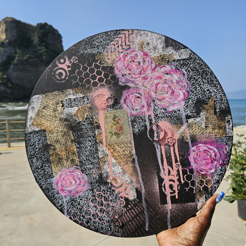 This original round mixed media painting features soft roses bloom in whimsical strokes, their petals melting into gentle drips and patterns inspired by nature’s geometry. The black backdrop enhances the luminous play of pinks, whites, and golds, Hand-painted layers of delicate script, golden fragments, and dreamy pink blossoms that seem to drift beyond the canvas, it blends elegance with modern artistry.