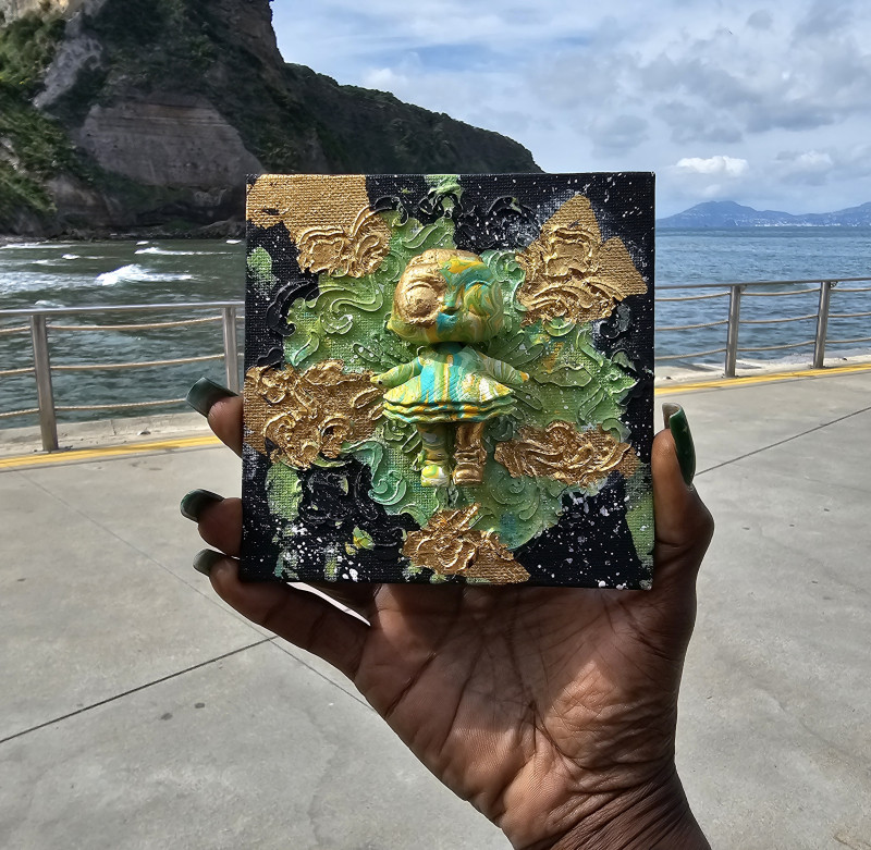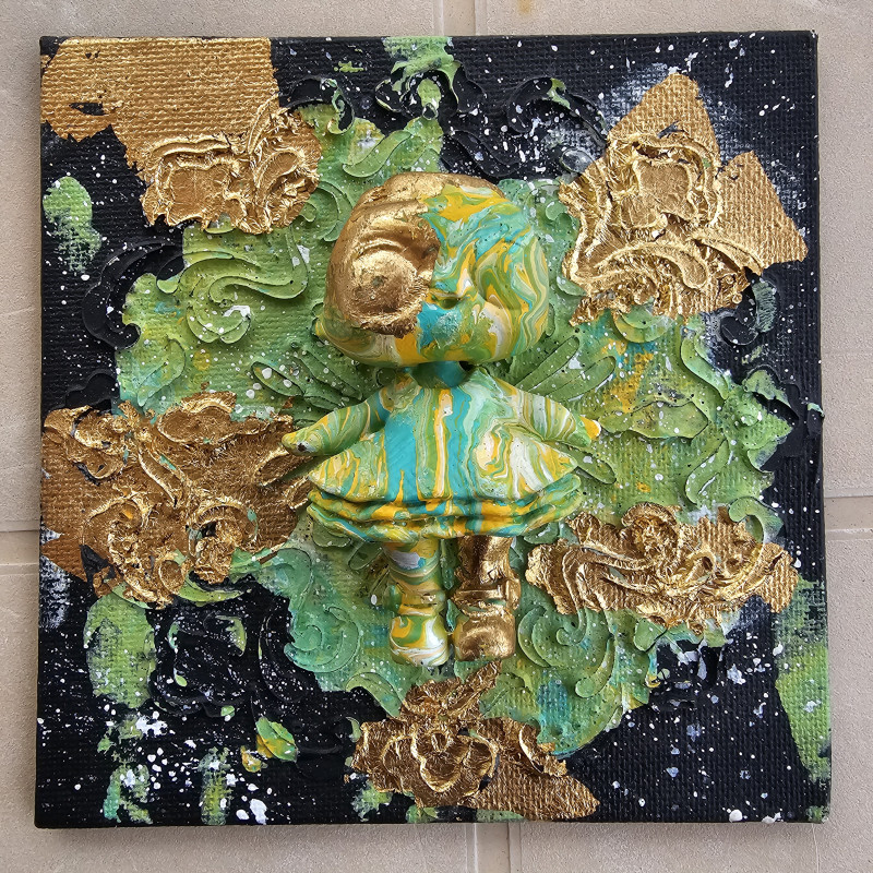 A piece where whimsical and sublime meet. It sparks conversation and playfulness with a 3D sculpture centerpiece that emeges from the canvas and seems to dance between celestial being and earthly bloom.