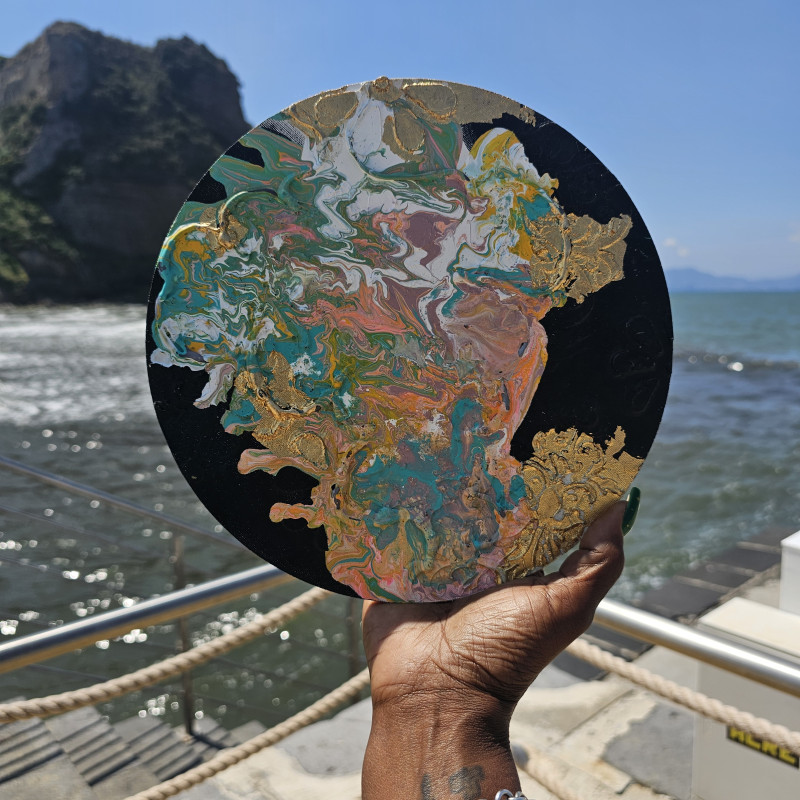 Bring elegance into your space into your space with this stunning handcrafted round abstract canvas. This sophisticated one-of-a-kind artwork spawned from using the fluid acrylic pour technique and it features mesmerizing colors of coral, lavender, peach, teal, and white that dance beautifully against a deep black backdrop. Gold leaf accents and adds luxury to the textured canvas. The colors and flow envoke movement along with imagination transforming any wall into a statement piece of contemporary art. This isn't just art but an invitation to step into a world of color, texture, and creativity.