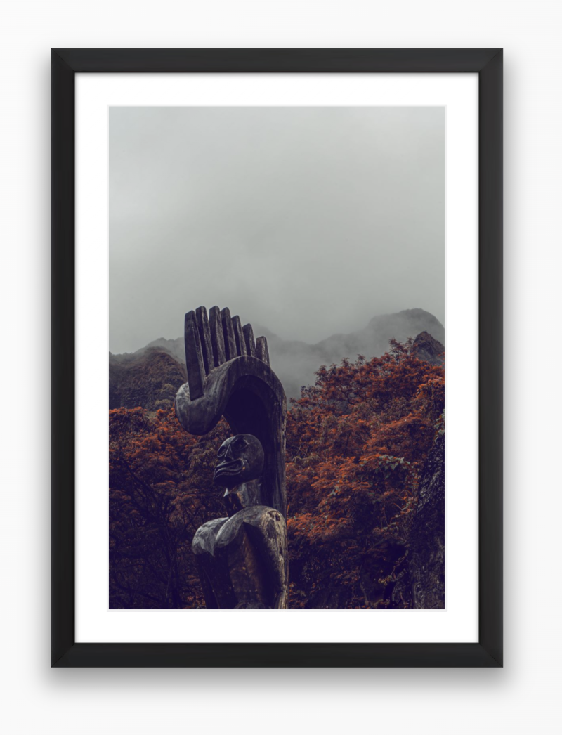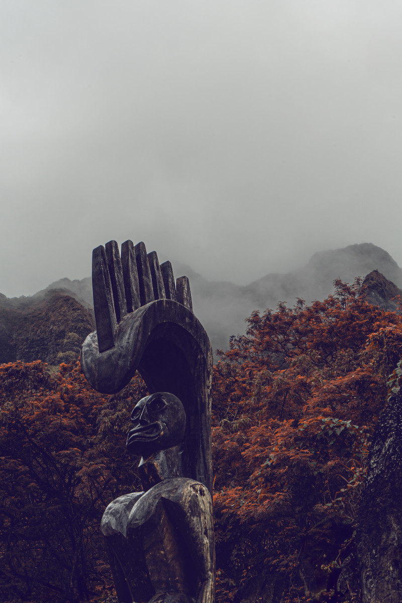 There stands Lono, the Hawaiian god of rain, amid a lush, muted backdrop of foggy mountains and autumn-touched trees. His figure tall and imposing, a robust silhouette against his island's background. His eyes hold the wisdom of ages, mirroring the serene calmness of the lands he reigns. As if on cue, the rain starts to fall - not heavily, but a gentle, life-giving drizzle. It lends an ethereal quality to the picture; the rain, Lono's divine manifestation, infuses the scene with a sacred tranquillity.