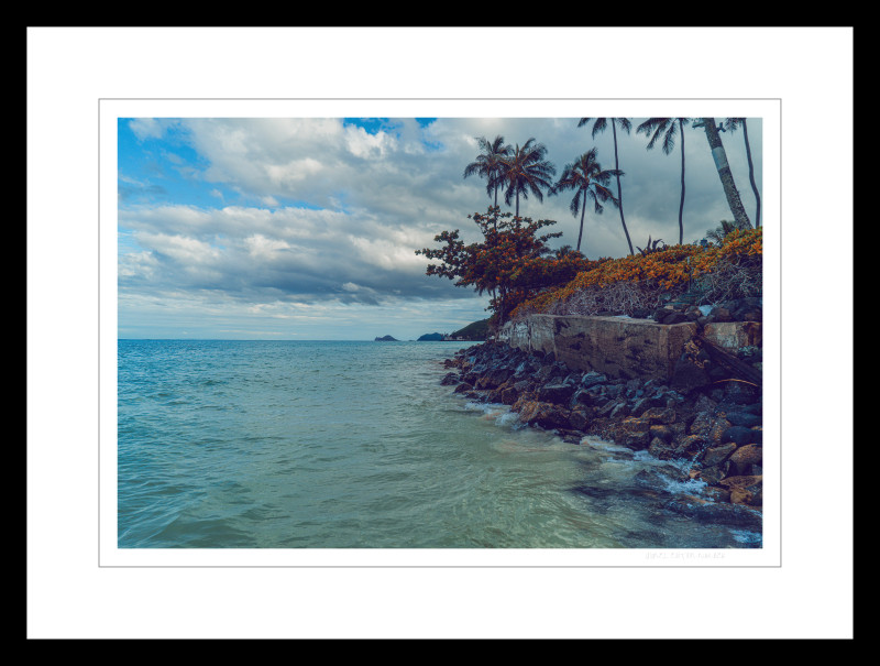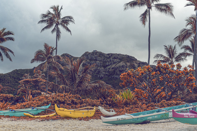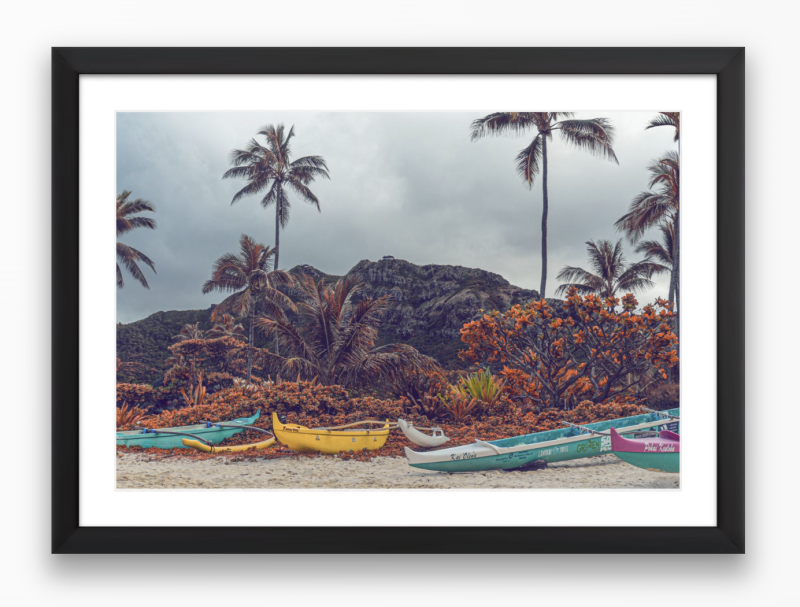 Peering through my lens, the scene "Four Wa’a" paints is unmistakably island life at its finest. There they are – four outrigger canoes, not on water but resting on the sandy beach, almost as if taking a breather. Their vibrant colors pop, making them the undeniable stars against a backdrop of a lush hill and lazy palm trees. These aren't just boats; they symbolize Hawaii's soul, laden with tales of old adventures and silent promises of more to come. Behind them, the hills watch protectively, and the palms sway, almost like they're whispering island secrets and cheering for the next voyage.