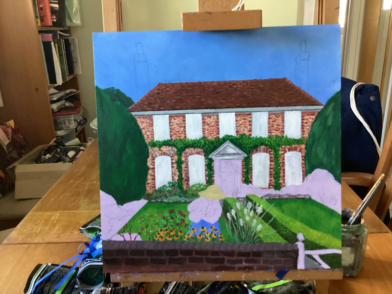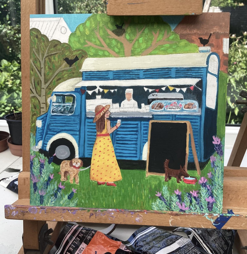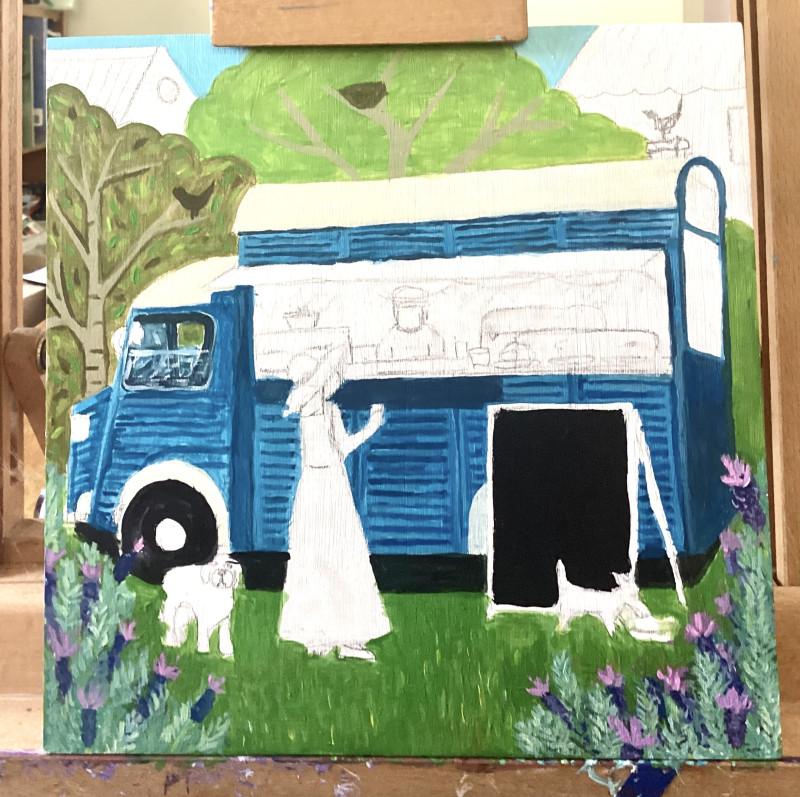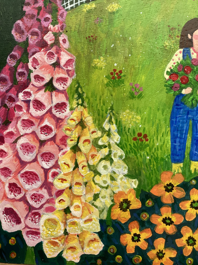 Using flat perspective, narrative composition, and symbolic detail, Helen’s paintings invite close, slow looking — offering moments of reflection on belonging, privacy, and the rituals of the everyday. Her work has been exhibited nationally, including with Outside In, and reflects a growing voice in the space between outsider art and contemporary visual storytelling.