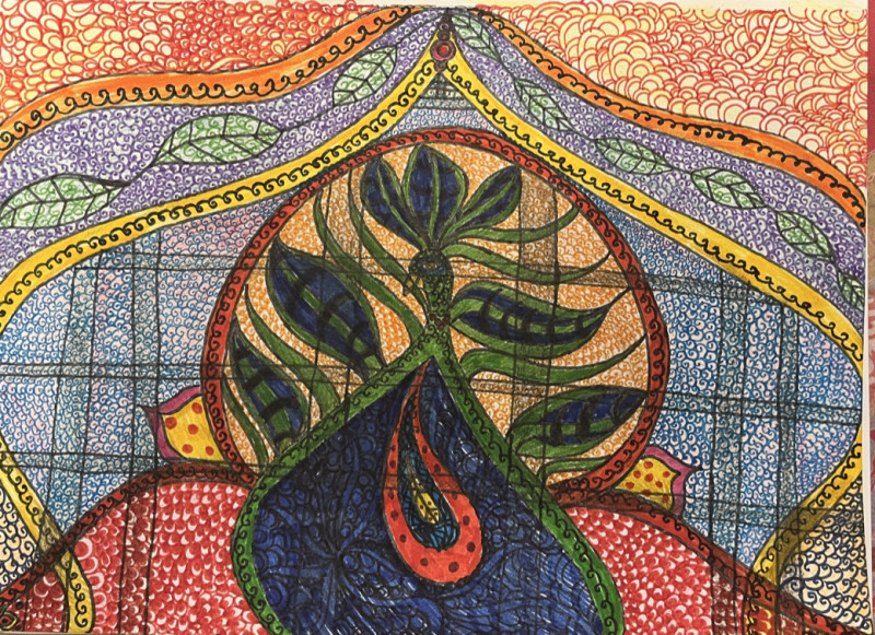 A blue bird with black patterns, surrounded by an abstract structure almost covered in swirls highlighted by different vibrant colors of reds, yellows, oranges, and greens