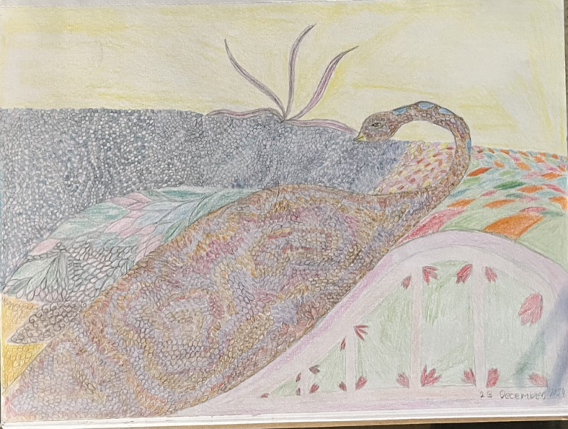 A stylized depiction of a peacock is highlighted with intricate, colorful patterns in its plumage, set against an abstract background of soft colors and lines. The subtle interplay of hues and detailed elements give the scene a dreamlike quality.