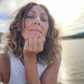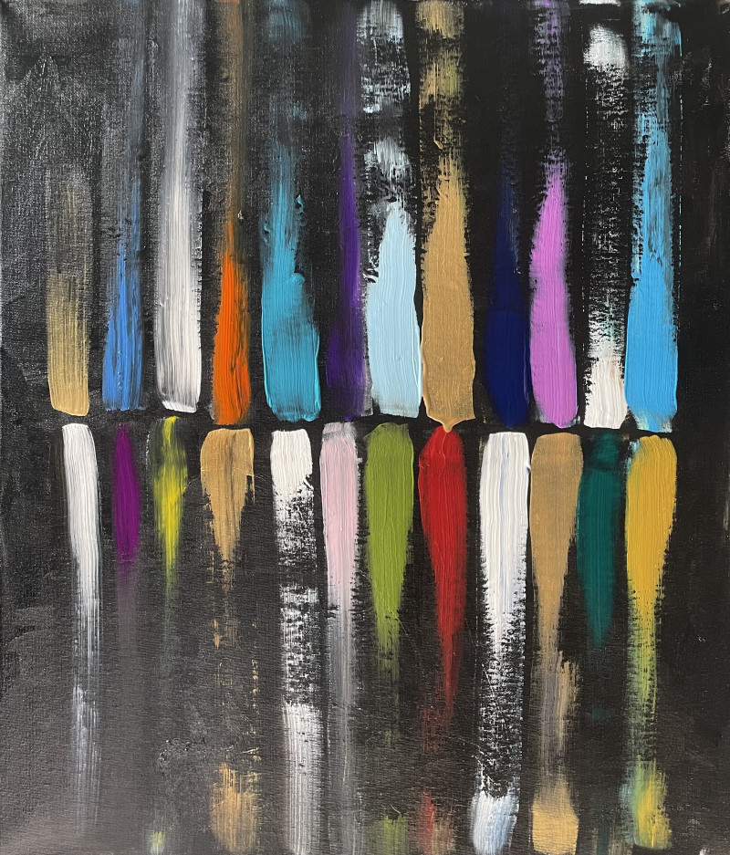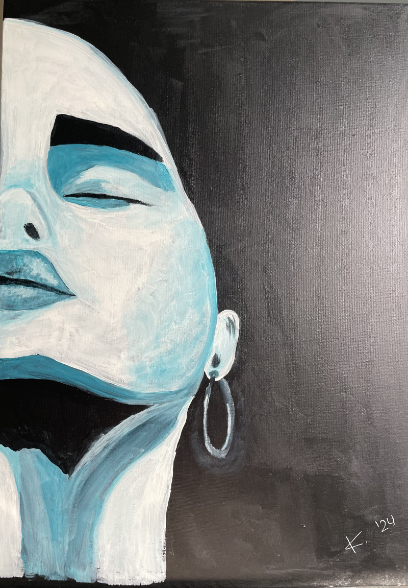 Medio rostro de mujer en acrílicas sobre lienzo. Combinación de azules, blanco y negro, sobre fondo negro.
