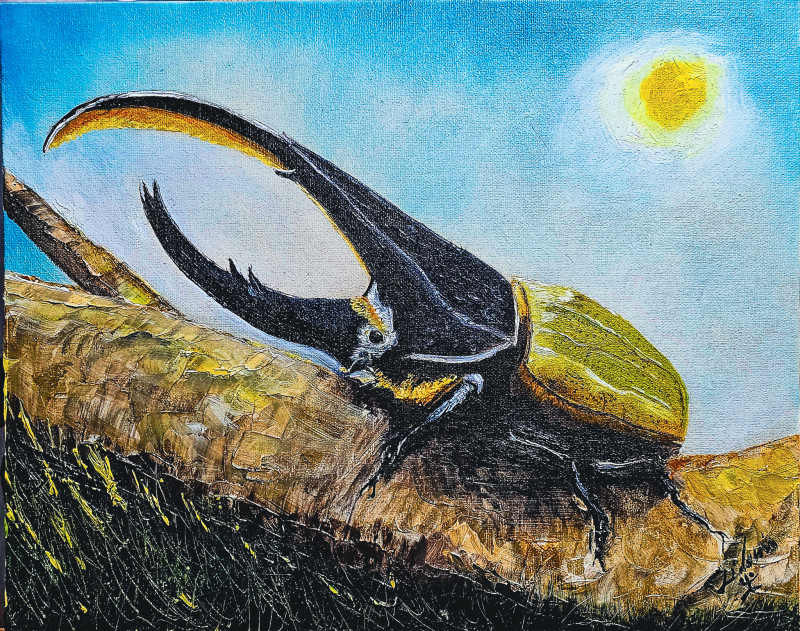 I finally finish the Hercules Beetle Title: Sunlit Titan. It captures the commanding presence of the Hercules beetle in its natural habitat. Rendered in rich oils, the work highlights the beetle’s iconic horn and golden carapace, contrasting its strength against the delicate scatter of wildflowers below. The artist’s textured strokes on bark and earth evoke the tactile reality of the scene, while the warm sunlight bathes the composition in a golden glow, emphasizing the creature’s grandeur. Both a celebration of nature’s intricate design and a meditation on resilience, this piece invites viewers to see the extraordinary in the seemingly small