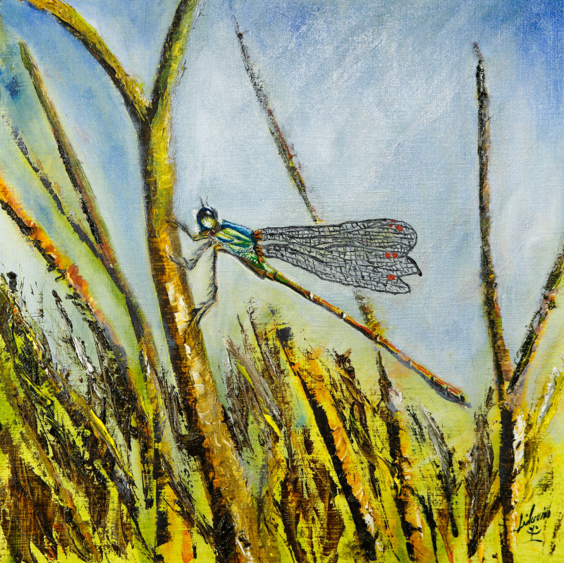 I wanted to capture a quiet moment of fragile grace—a damselfly clinging to a slender branch amid the chaos of wind and light. Nature often reveals its poetry in stillness, and this little creature, with its gossamer wings and vibrant body, became my subject of contemplation.