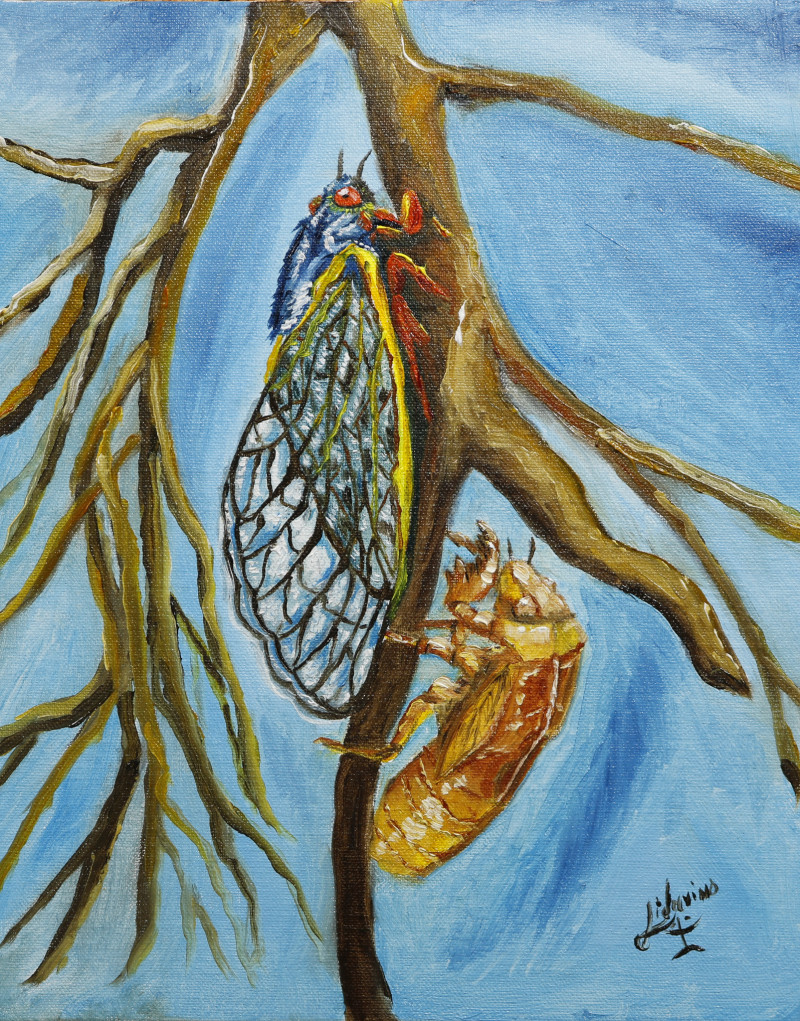 I try to captures the transformative moment of a cicada’s life — the dramatic shedding of its nymph shell to reveal its vibrant, winged form. Set against a luminous blue sky, the composition contrasts the earthy, amber tones of the discarded exoskeleton with the iridescent blues, reds, and golds of the adult cicada. The intricate lattice of the insect’s wings, rendered with precision, evokes the fragility and resilience of life’s transitions. This work invites viewers to contemplate metamorphosis not only as a biological process but also as a universal metaphor for growth, renewal, and the courage to leave one’s old self behind.