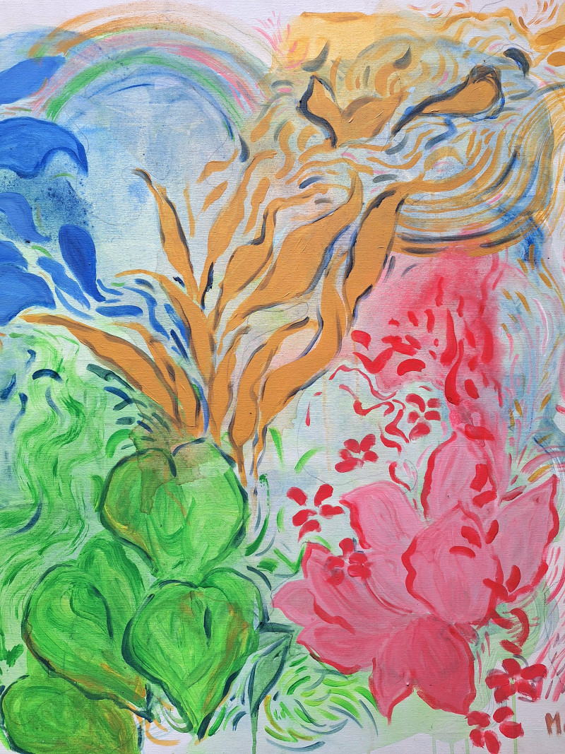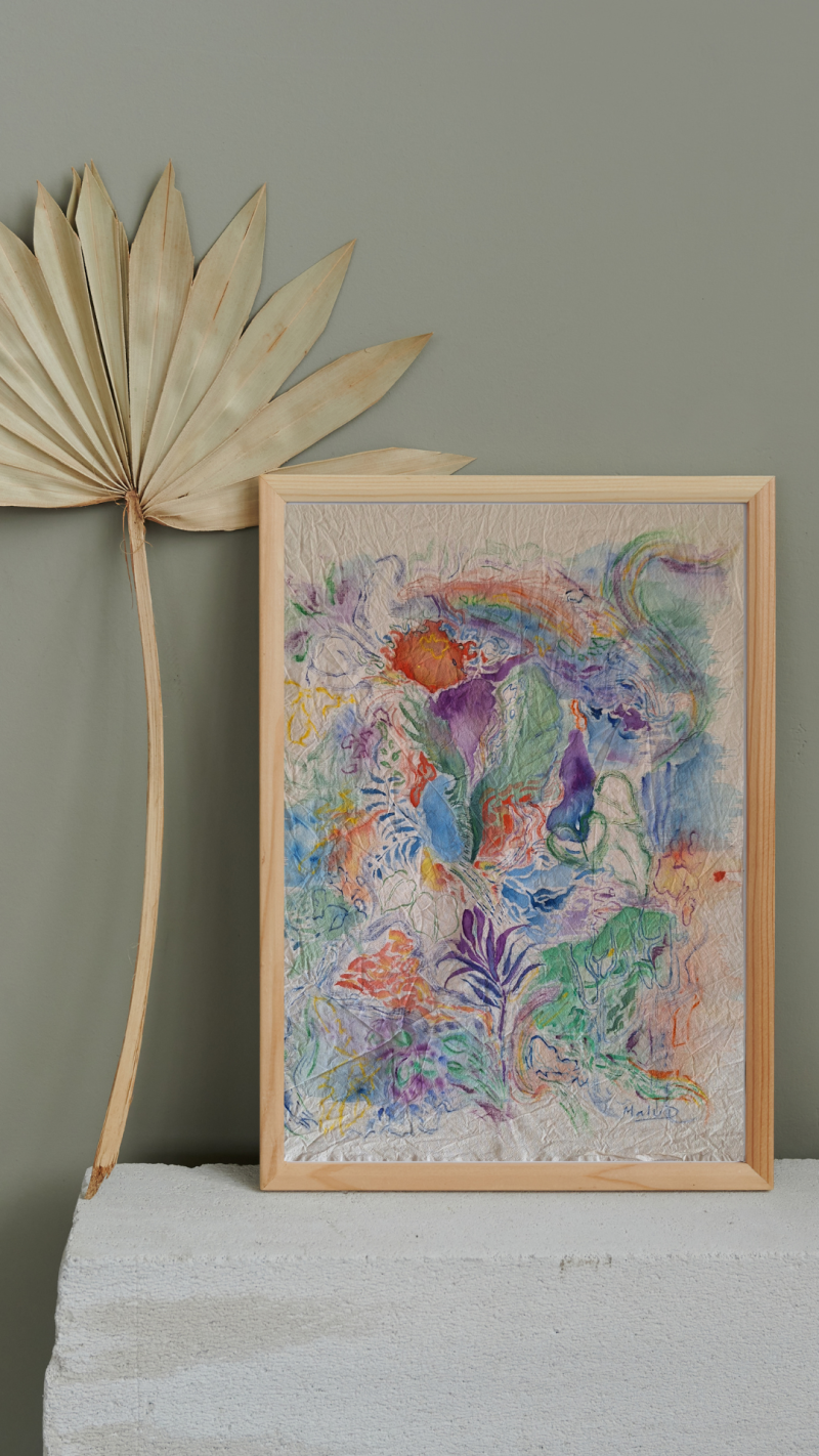 Es una obra inspirada en paisajes y elementos de la naturaleza, donde la abstracción y figuración crean una atmósfera cálida y mágica.
