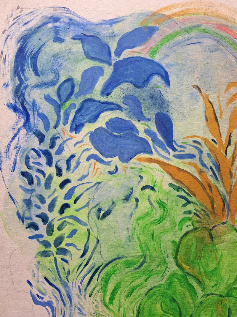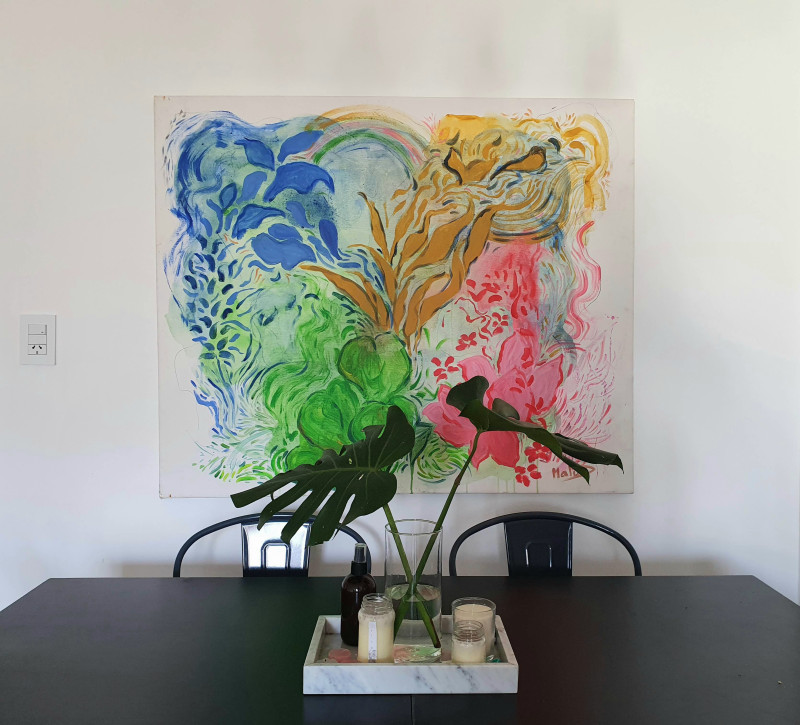 Lo figurativo y abstracto conviven, las formas orgánicas, los colores de la naturaleza y sus cuatro elementos.