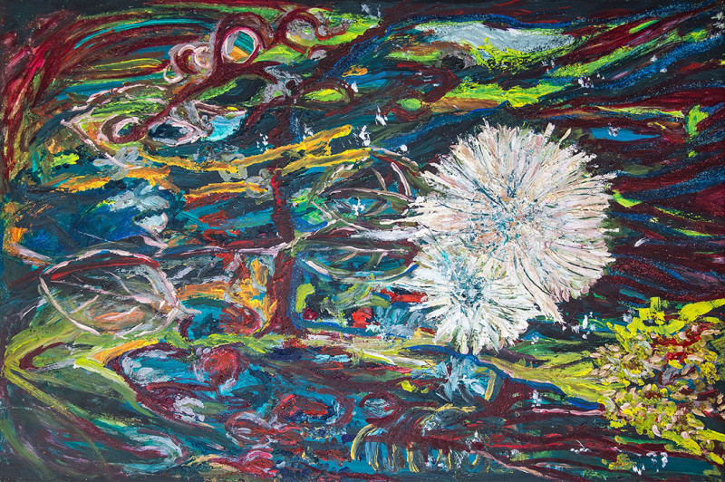 BOOM is a bright white crysanthemum almost centered between foliage and branches. It represent focus and hope, standing among nature, branches, foliage, and rays. It meant to be seen and noticed and felt the beauty of itself and surrounding