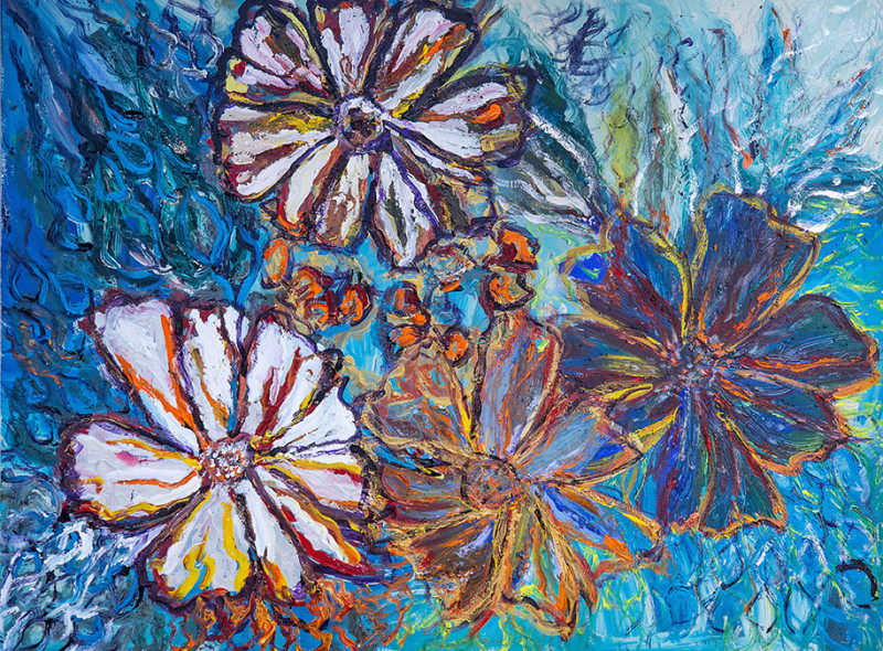 This painting features a large, expressive bouquet rendered in shades of soft blue and warm pink. Rich with texture, each bloom feels tangible—almost as if you could reach out and touch the petals. The brushstrokes add movement and life, giving the bouquet a sense of presence and vibrancy.