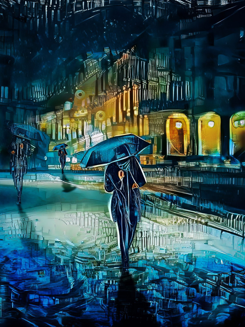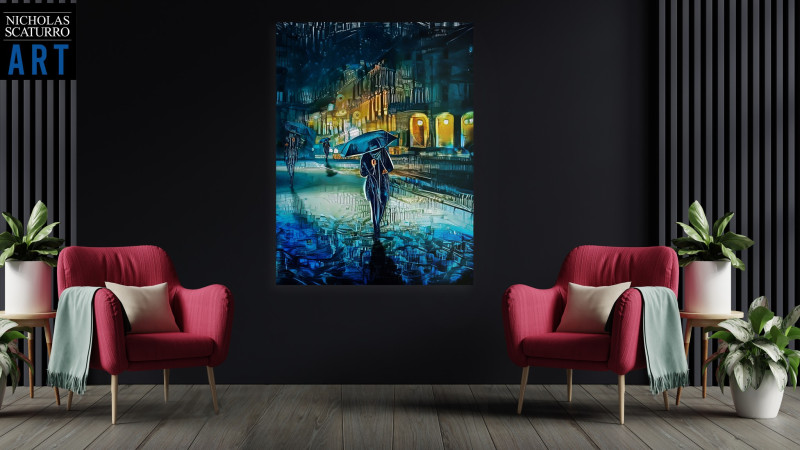 The painting portrays several individuals braving the rainy evening, most likely returning from a long day of work and on their way to the train station. Against the backdrop of a dark and brooding sky, the warm glow of the tungsten light illuminates the inside corridor that connects all the shop houses. As the rain falls from the heavens, it creates a mesmerizing and intricate pattern on the wet pavement, reflecting the incedent angle of the surroundings.