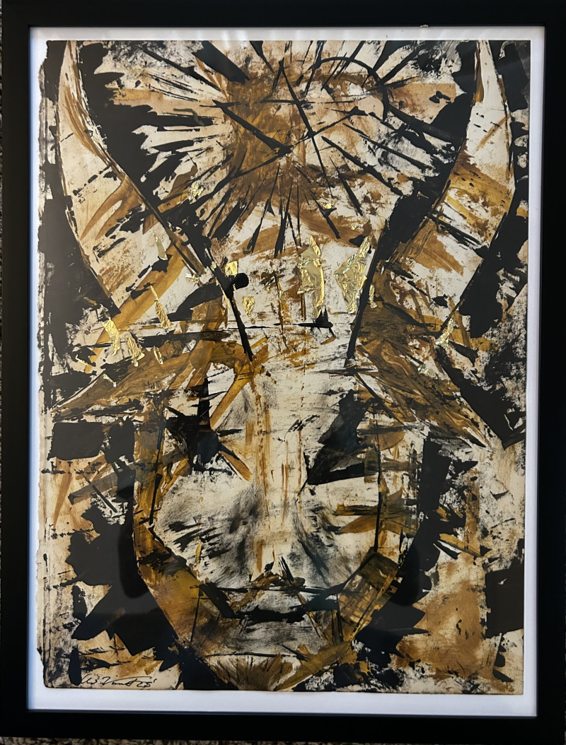 A rendition of the Baphomet with a Bohemian quality, this piece channels both mysticism and rebellion. Layers of gold leaf, acrylic, and earth-toned pigments intertwine to form a haunting visage — a symbol of balance, transformation, and hidden wisdom.