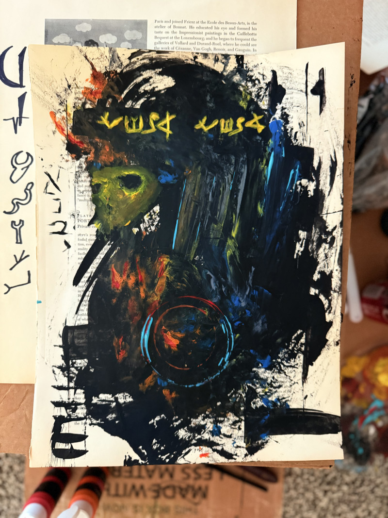 An abstract depiction of an Ancient Alien, painted in layered acrylics on aged paper and adorned with ancient Hebrew hieroglyphs—symbols that bridge the divine and the extraterrestrial.