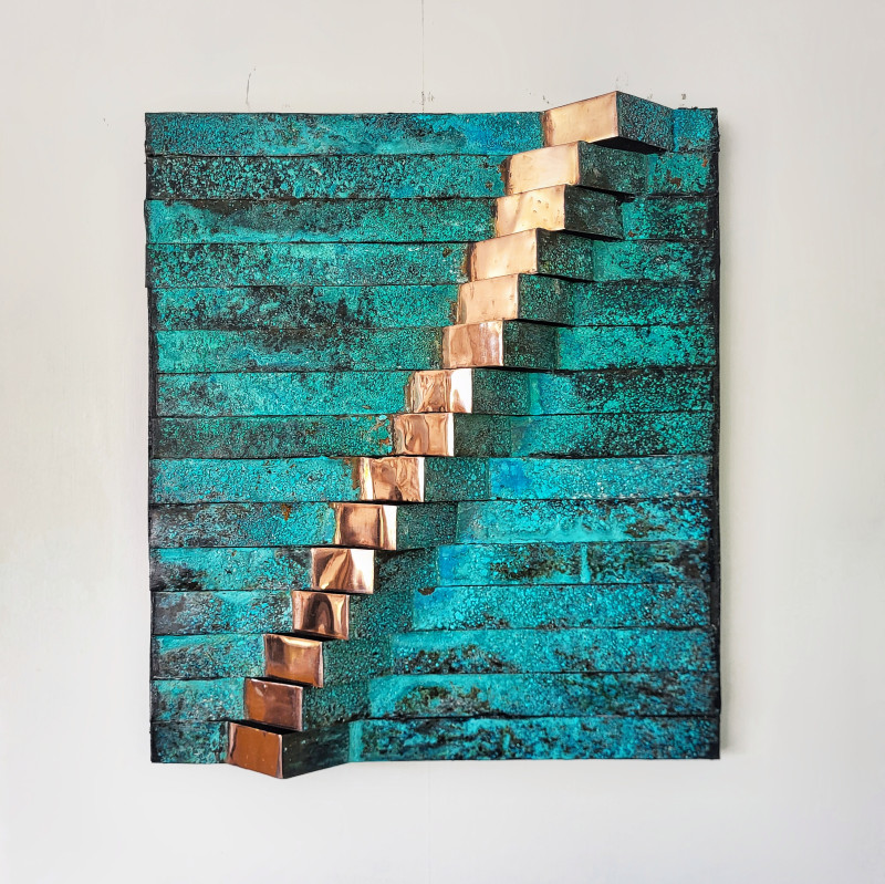 Paul Wright ‘paints’ with reclaimed copper, creating three dimensional canvases informed by an ambiguous and variable process of metamorphosis; pieces which explore the powerful and contradictory world of the seas off the Penwith peninsula, suggesting the interplay of light on a watery surface, and the stories contained within.