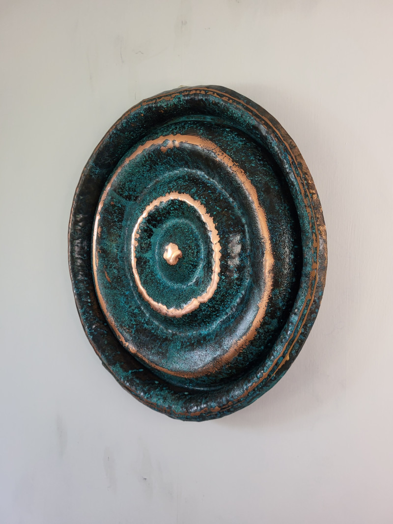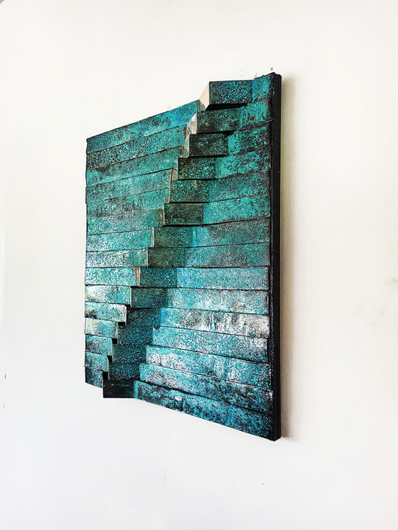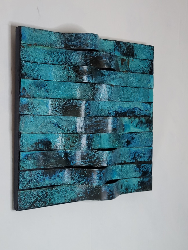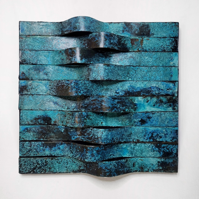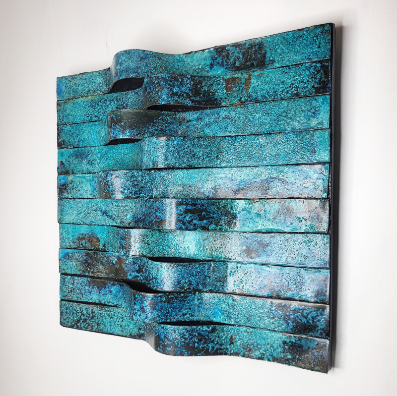 The West Cornwall-based artist employs found copper to meticulously craft tactile and intriguing one-of-a-kind pieces. His artistry shapes angular wave forms, each piece undergoing a transformative chemical process, accelerating the metal’s natural oxidation, breathing life into the sculptures, channeling the sea’s graceful yet capricious beauty into each work of art. Variation is key to Paul’s process, as each piece is wildly tactile and unpredictable; the patina of the copper is always the main focus.
