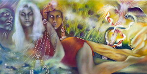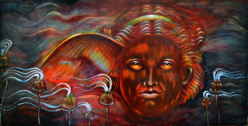 This consequence is symbolically represented in the foreground of the painting by poppy pods whose exhaling breath of lustrous trance-inducing vibrations is the vehicle of restitution.