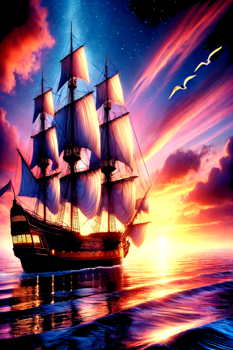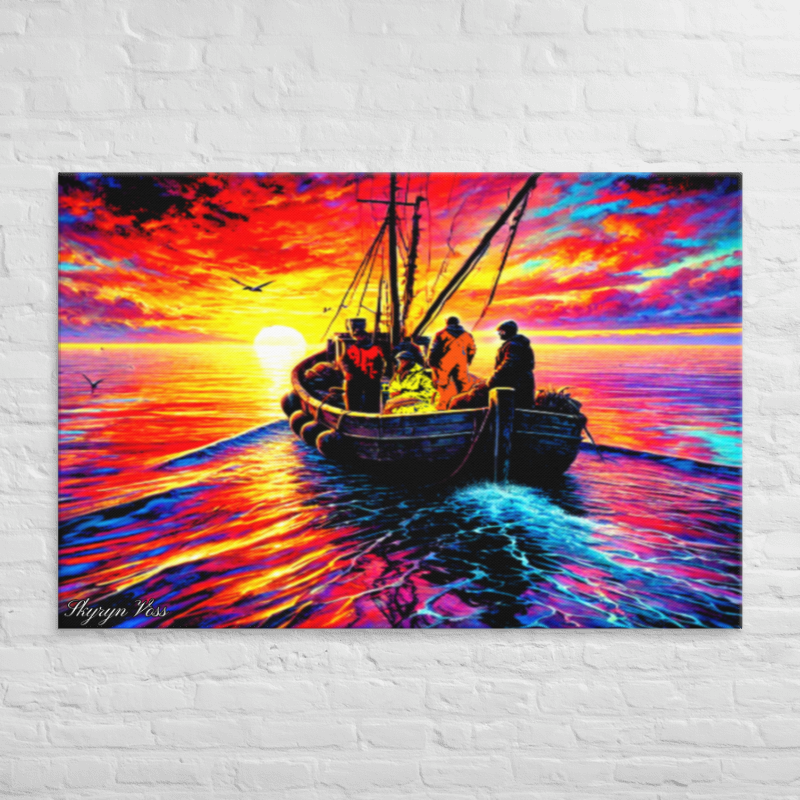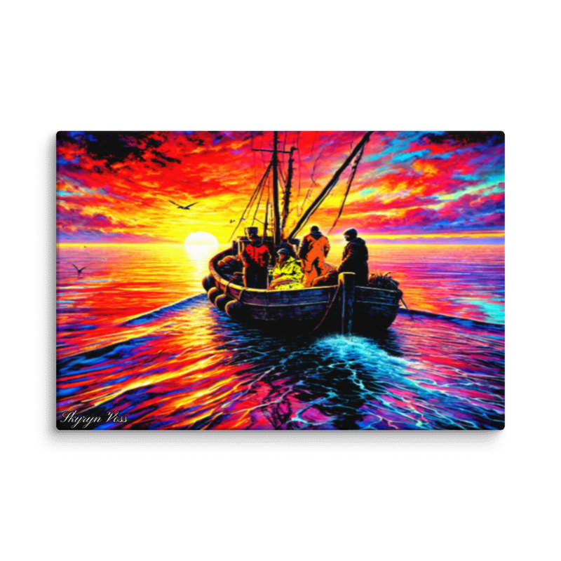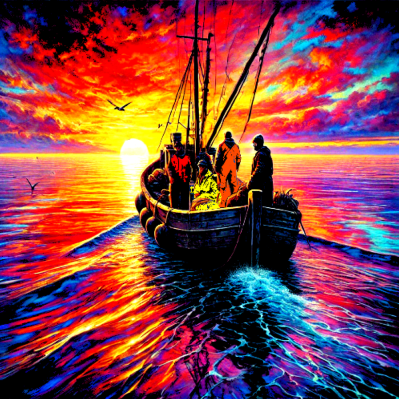 A crew of Ethereal Fishermen Drifting towards a Brilliant sunset, signifying there departure from this world.