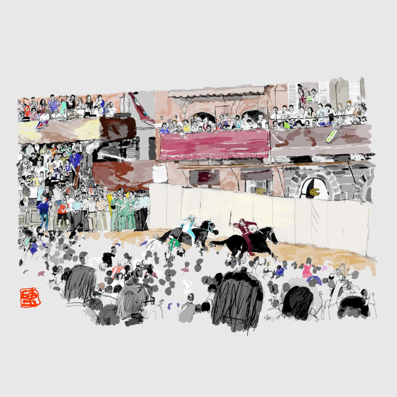 Racing for Victory and the homor and history of Siena's winning Contrada or inner city. Done in Virtual reality.